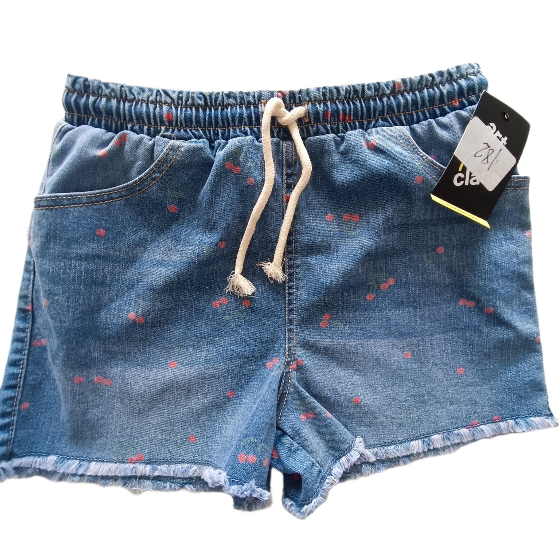 NUEVO Short Art Class T10-12 Mezclilla azul. Cerezas. Elasticado y cordón cintura. Desflecado piernas. Algodón y poliéster.