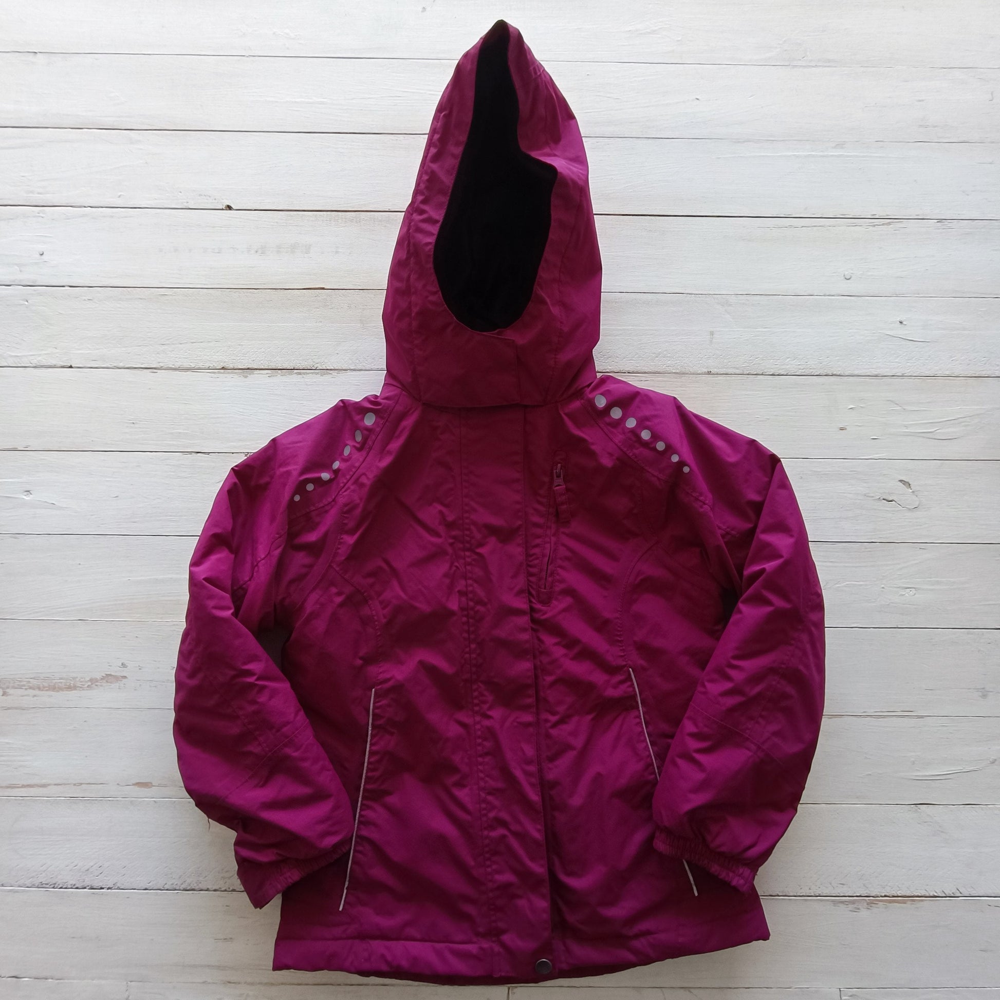 Parka Yigga T10 Doble capa desmontable. Fucsia detalles reflectantes en los hombros y bolsillos en capa externa. Polerón negro interno de polar. Usado, con roce en cierre y pretinas.